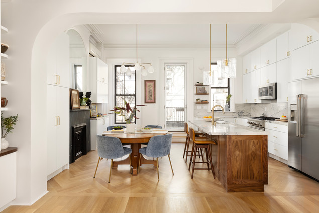 For a client who loves to cook and entertain, the original kitchen in this Park Slope brownstone simply wasn’t cutting it. Cramped and short on storage, it needed a complete reimagining. By relocating the powder room—which had claimed valuable square footage—we not only opened up the layout but also introduced a new window, filling the kitchen with natural light.